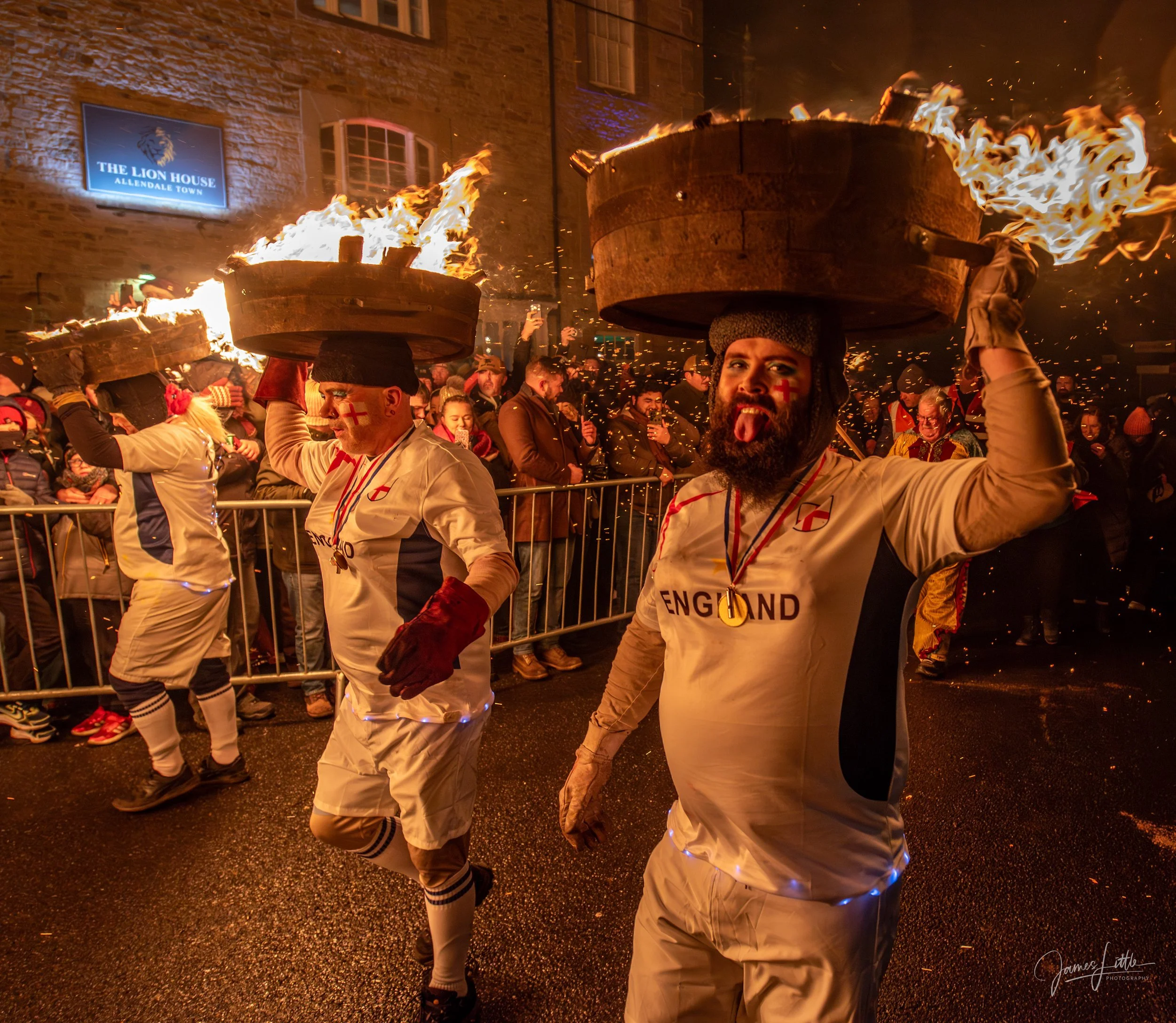 As night fell, I followed the procession through the village streets, photographing the guisers as they carried blazing barrels balanced on their heads. Dressed in colourful costumes and cloaked in smoke, they moved steadily through the crowds, accompanied by the sound of a brass band and the crackle of burning wood. The light from the flames cut through the darkness, illuminating their faces as they went.