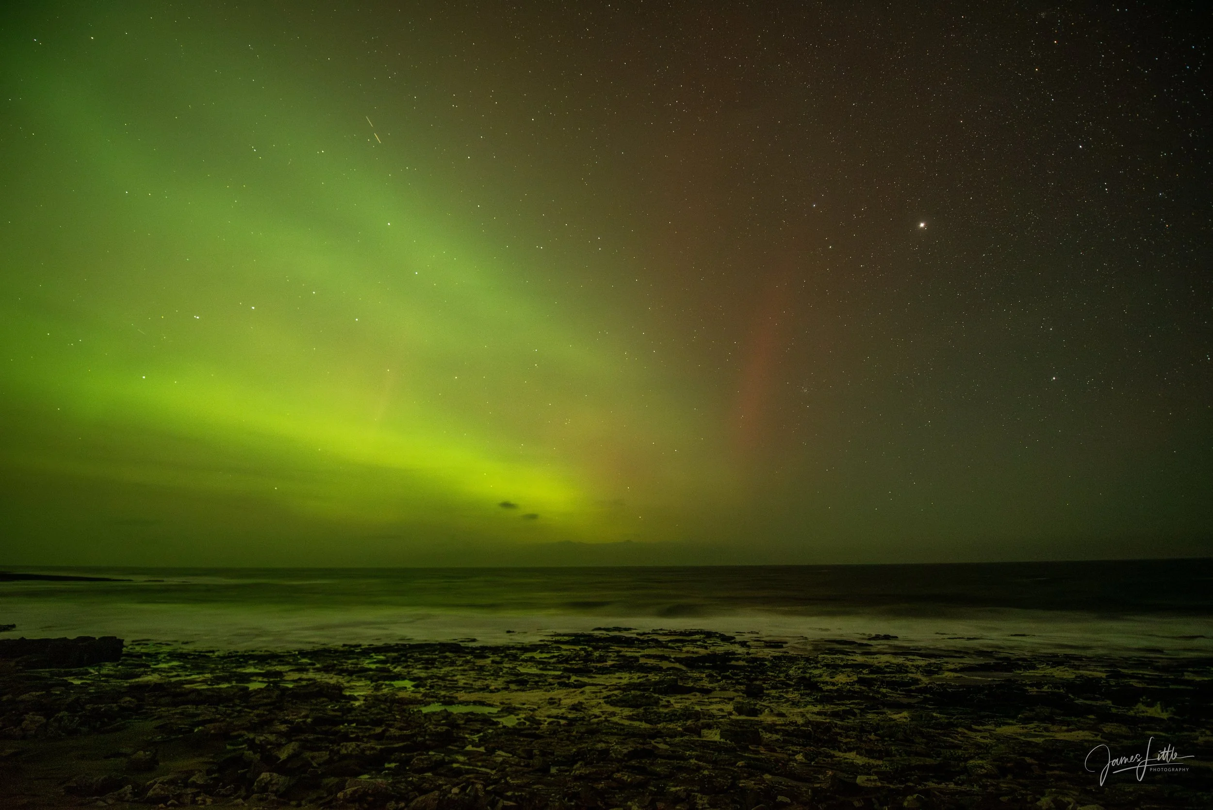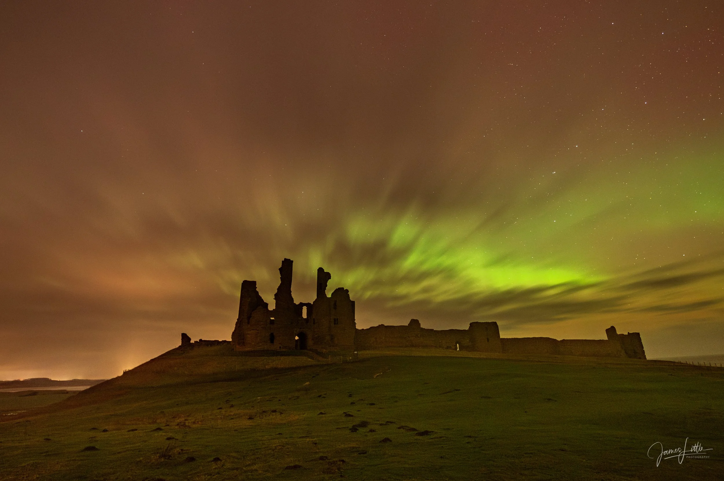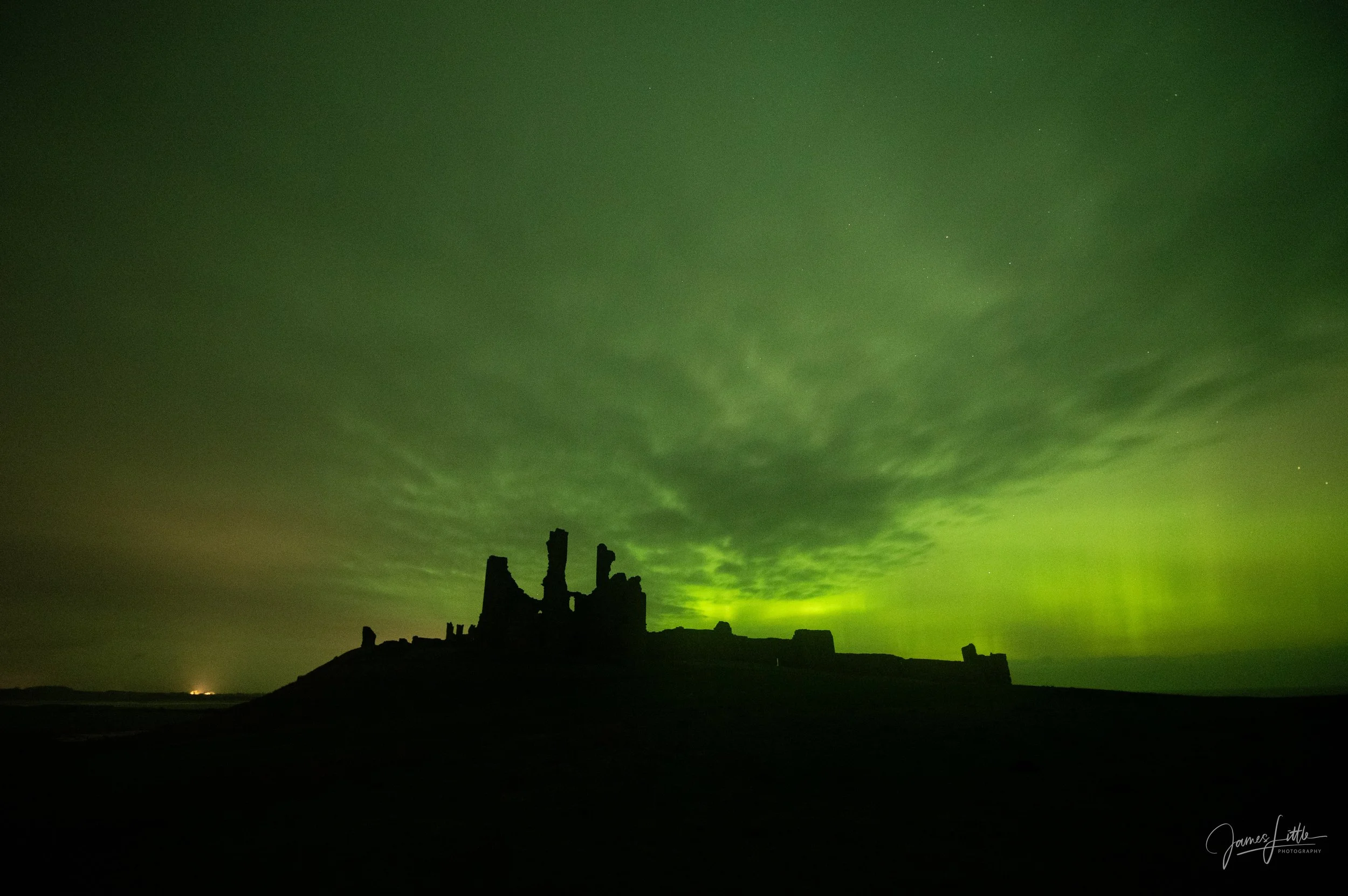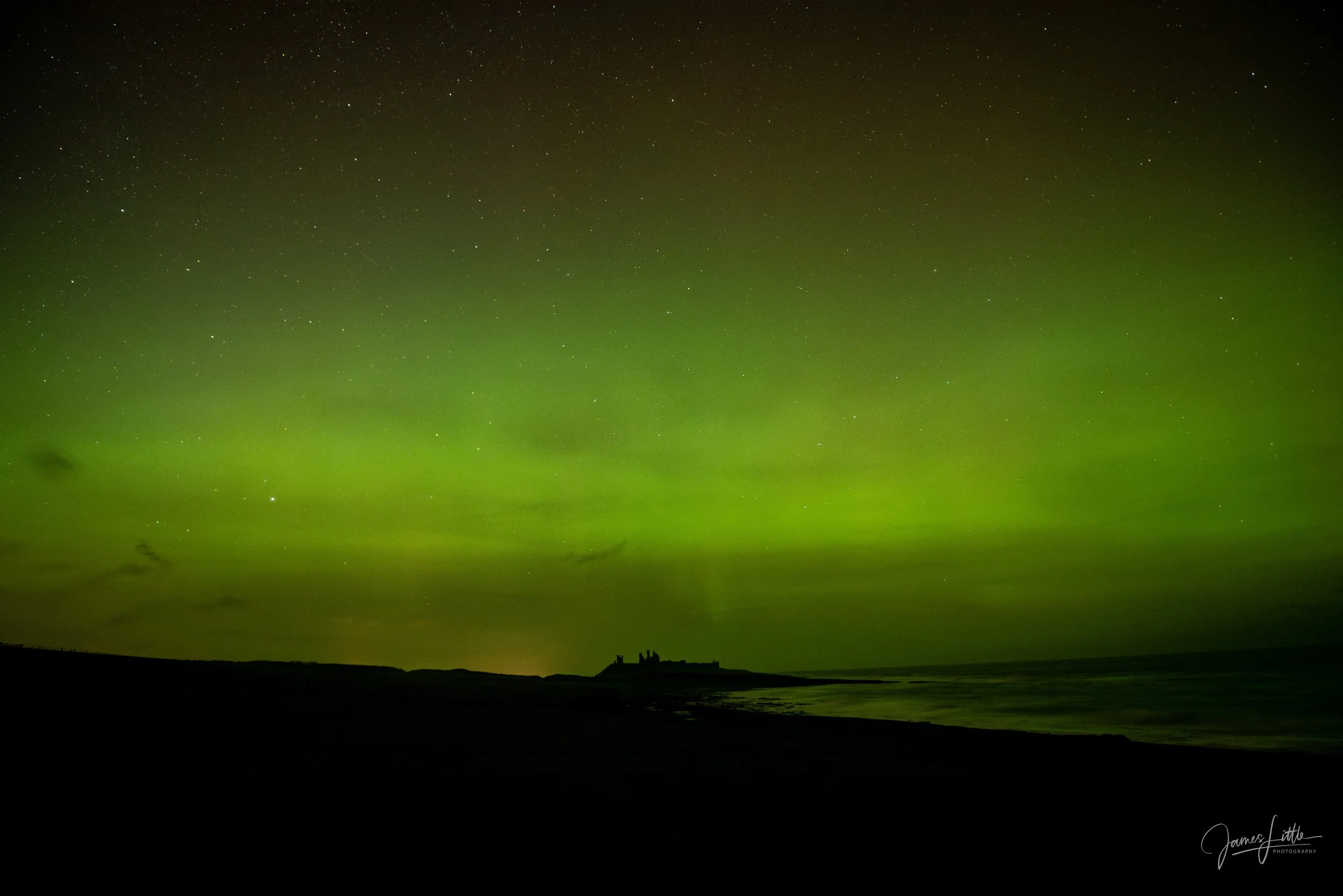 Luckily Tuesday evening brought a brief spell of clear skies so I made the drive up to Dunstanburgh Castle in Northumberland. The aurora was there, vivid greens and curtains of light flickering above the horizon. But by then the storm’s most intense phase had passed I had unfortunately missed it. I did manage to grab some photos, though they weren’t quite the jaw dropping spectacle I’d imagined.